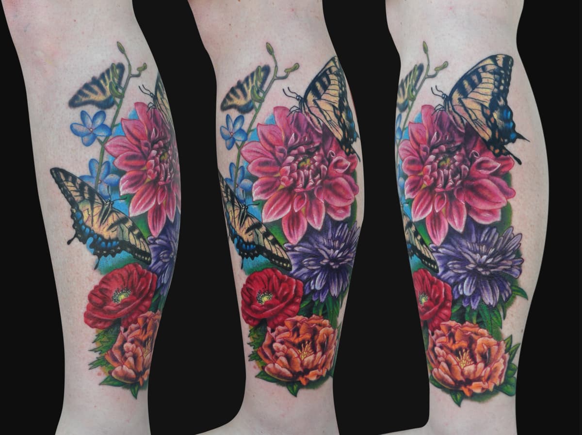 Colourful Flowers Tattoo On Calf Flower Leg Tattoos Calf Tattoo Colorful Flower Tattoo